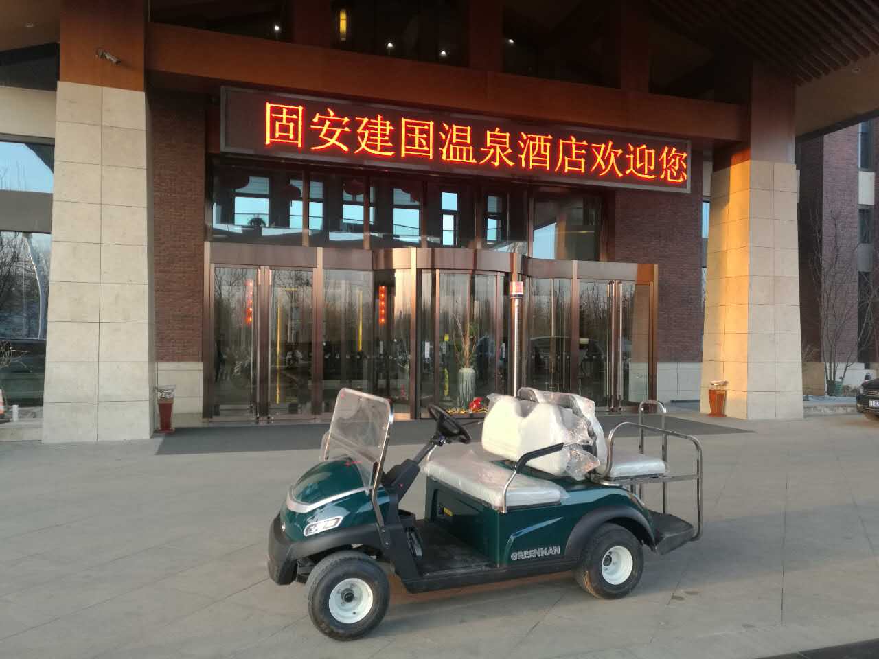 2017年3月8日在河北省廊坊市固安溫泉休閑商務產業園交車1臺四座電動觀光車。